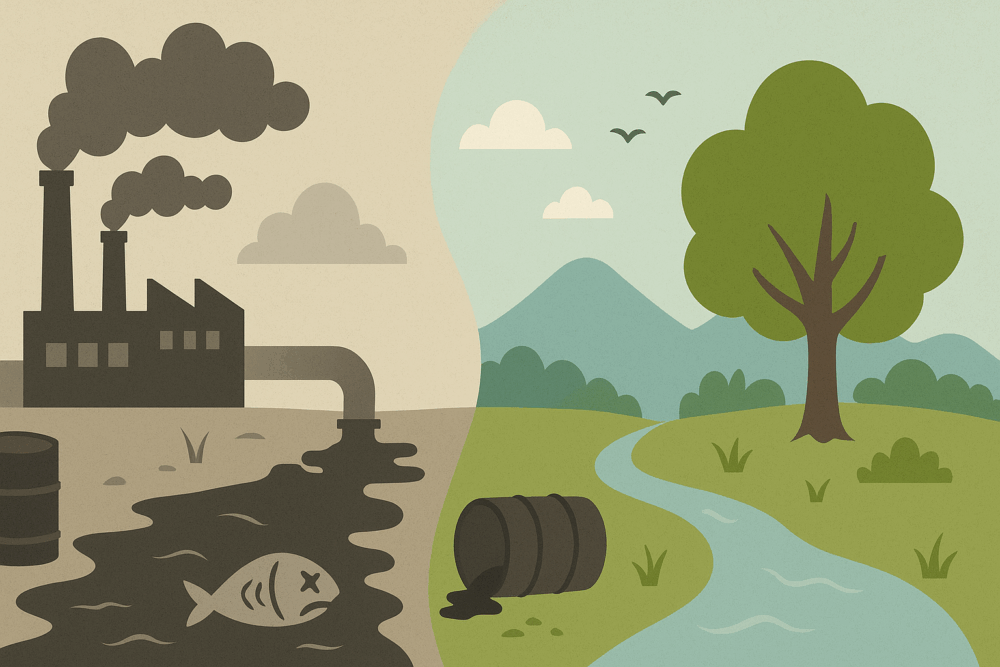 – مخلفات المصانع: وهي من أخطر مصادر التلوث، لما تحتويه من معادن ثقيلة كالزئبق والزرنيخ والرصاص، التي تلوّث الماء والتربة وتدمّر صحة الإنسان. وقد ثبت تلوّث أنواع من الأسماك في بعض البحار بهذه المعادن إلى درجة عدم صلاحيتها للاستهلاك البشري.